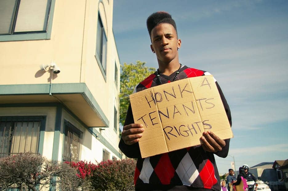 The videographer explains: “I came across them (Marin Way Court tenants) on Wednesday, April 28, protesting on the corner of 20th Avenue and International, Oakland. I was actually filming something else but after talking to Aiyahnna knew that this outrageous situation needed coverage. The prior evening the residents had been swooped on by six police officers, harassed and had security locks to their property changed, their property and cars smashed and issued with ultimatums to leave. This all happened on the order of a fictitious landlord.” – Video: ©Astrid Edwards, Rockmother Films