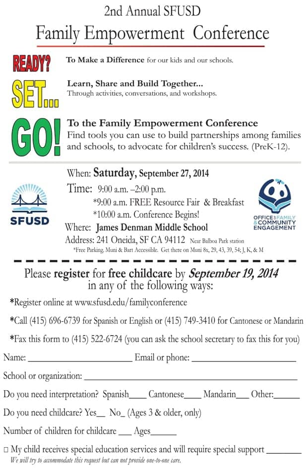 San Francisco Unified School District (SFUSD) is hosting its Second Annual Family Empowerment Conference (FEC) this Saturday, Sept. 27, at Denman Middle School in San Francisco. The focus of the conference is to empower families, parents and guardians, students and community members to get involved in their students’ education.
