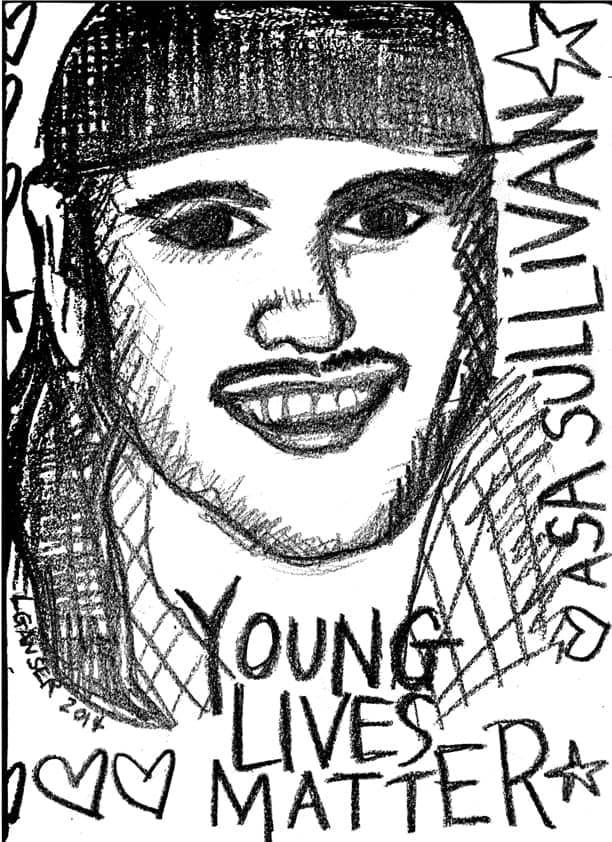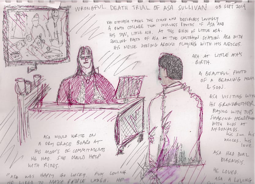 What if Asa had been witness to this carefully constructed story, developed over eight years, played out during a month-long trial by a parade of SFPD officers and their changing stories, “expert witnesses” paid hundreds of dollars an hour to testify, and documents dug up from the span of Asa’s life to try to prove that his death was justified. That the police had no choice but to shoot him. That that’s what he wanted. Suicide by cop.