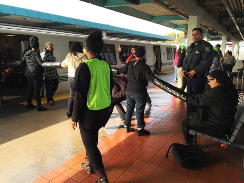 We locked ourselves to the train using heavy equipment like U-locks, chains and lock boxes. And the goal of that action was to shut down BART for four hours and 28 minutes – four hours because Michael Brown’s body lay in the street for over four hours, and 28 minutes because every 28 hours a Black person is killed by police, state sanctioned violence or vigilantes.