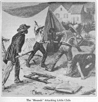 Hostilities against the dark-skinned Latin Americans were not confined to the mines. In the summer of 1849, the “Hounds,” a group of ruffians in San Francisco, were formed ostensibly for mutual assistance in times of distress and danger. Actually, however, the Hounds group was organized to shield its members against prosecution and arrest. The Hounds directed their attacks against Chileans and other Latin Americans, “who were beaten and maltreated in a most shameful manner, and whose tents and shacks were robbed and burned” (Cross, 1935:18).