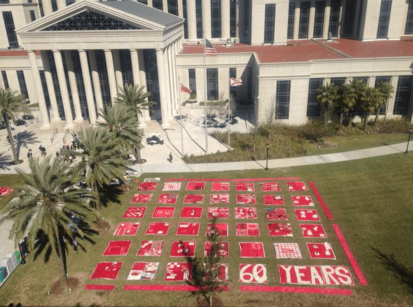 Organizers are hosting a number of direct actions in support of Alexander’s freedom. In Jacksonville, a press conference was held on the Duval County Courthouse steps the day she was released. Blanketing the courthouse lawn was The Monument Quilt, 350 quilt squares containing stories from survivors of domestic violence and sexual assault in solidarity with Marissa Alexander.