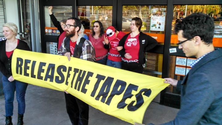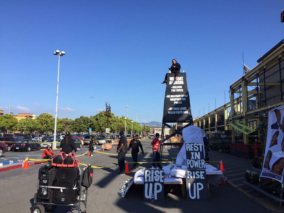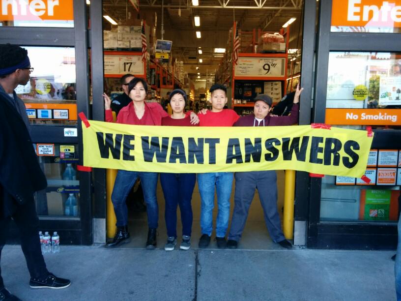 Approximately 17 activists from Black Lives Matter, Anti-Police Terrorist Project, Asians4BlackLives and Xicana Moratorium Project chained themselves to multiple store doors, blocking access, as supporters rallied outside. Protesters successfully shut down the store for five hours, the amount of time Yuvette Henderson lay in the street after being shot by police.