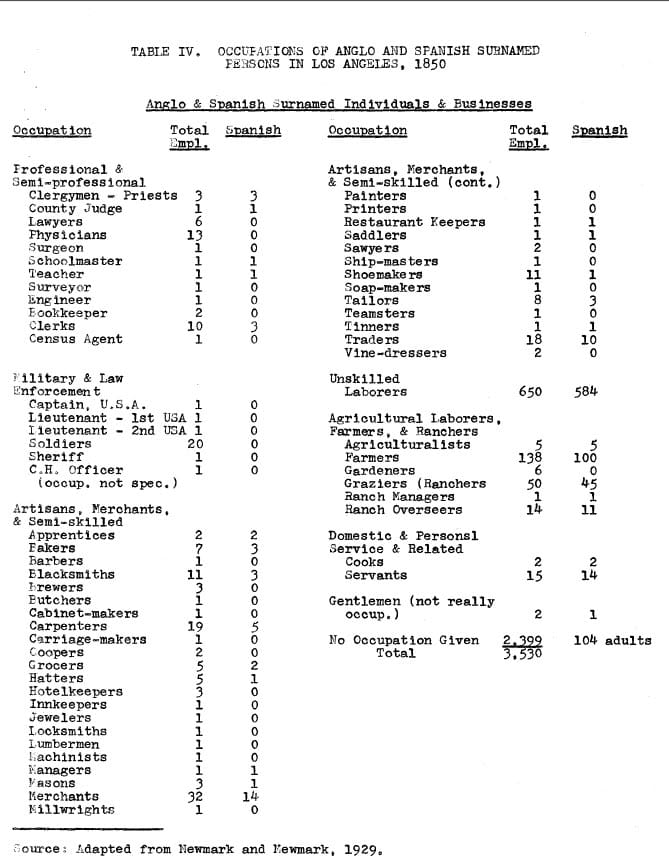 In California, Mexican American businesses developed in a fashion analogous to those of Negroes in the East. In Los Angeles as early as 1850, for example, Anglos had begun to assume many positions of responsibility, even though they were numerically inferior. An analysis of the early census for that city reveals that great changes were taking place in which Mexican Americans declined in agriculture and business, but their involvement as common laborers increased (see Table IV).