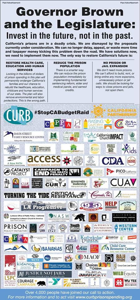 We ask if you are an organization that wants to send a support letter, if you are a family member who can help us get support from your loved one inside prison or if you are an individual who wants to be a part of our quick response team, please take action now here. You can get the most up to date information about the budget and bills here: http://curbprisonspending.org/take-action/advocacy/.