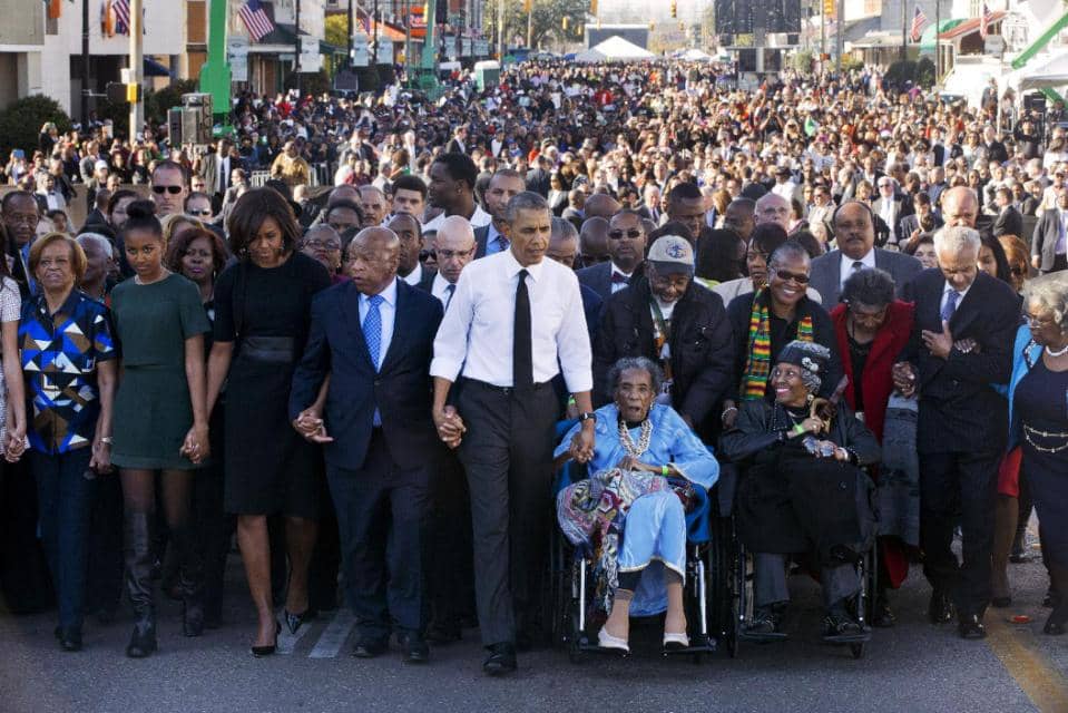 He did it again in the Selma, Alabama’s 50th anniversary at the Edmund Pettus Bridge. His central message: No one can doubt things are better since Selma. No one.