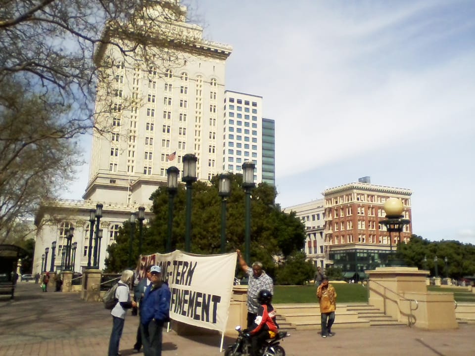 We had an altar with a photo of Robert “Robio” C. Fuentes Sr. (Nov. 23, 1958 – Sept. 19, 2014) at age 21. Robio was in Pelican Bay State Prison (PBSP) Security Housing Unit (SHU) for 20 years. People used blue tape to mark off an 8-foot-by-10-foot space, the size of Robert’s SHU cell. We had banners that said “End Solitary Confinement” and “Solidarity with the Prisoners. SHU=State-Sanctioned Torture!”