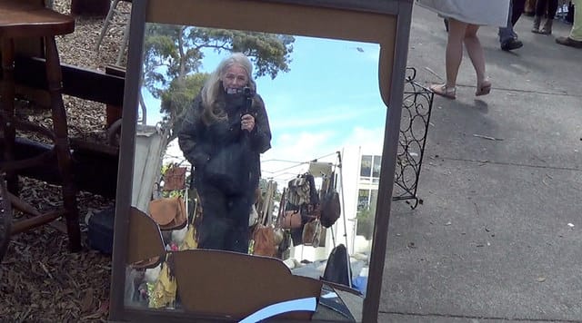 Before I sit down and think what other damage I can do, here’s me in a wriggly wavy old mirror. Watch out, or I may video you out there in Treasure Island Flea Land.
