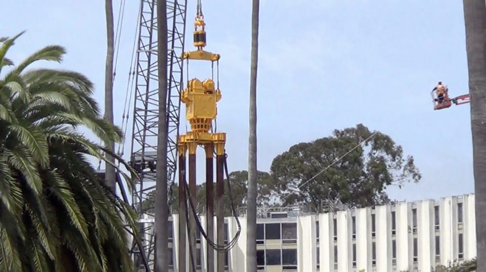 On Treasure Island May 28 and 29, 2015, the earth trembled and shook in a fenced-off location between the Island Cove Market and the Starburst Barracks. Engineers from Lennar’s vibro-compaction geotechnical subcontractor, Jafec USA, repeatedly sank four huge vibrating shafts 50 feet deep into Treasure Island fill, testing for the effect on the soil, groundwater and mud of the man-made island.