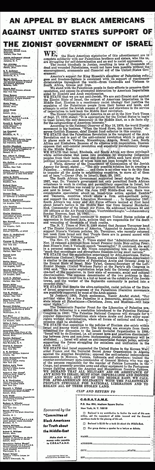 The statement represents a bridge between the current generation of Black activists and those who participated in the movements of the 1960s and 70s. Other signatories include Black Panther Party Minister of Culture Emory Douglas, former SNCC chairman Phil Hutchings, as well as Kwame Somburu and Emeritus Professor Charles E. Simmons. Hutchings, Somburu and Simmons were all signatories of a 1970 ad in The New York Times of Black activists and scholars in support of the Palestinian struggle against Zionism and the occupation.
