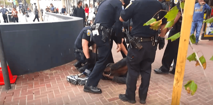 Witnesses said there had been a call about somebody waving sticks around. No one, at least no one who stayed long enough after the filming, could say for sure where the call came from. One woman said that she heard someone say that one of the deli managers called. By the time I arrived where Joe Bland (as we’ll call him) was, several officers had arrived on the scene and forced this man to the ground, which is where this footage begins. And they held him down, much of the time half-naked, for at least half an hour on one of San Francisco’s busiest streets.