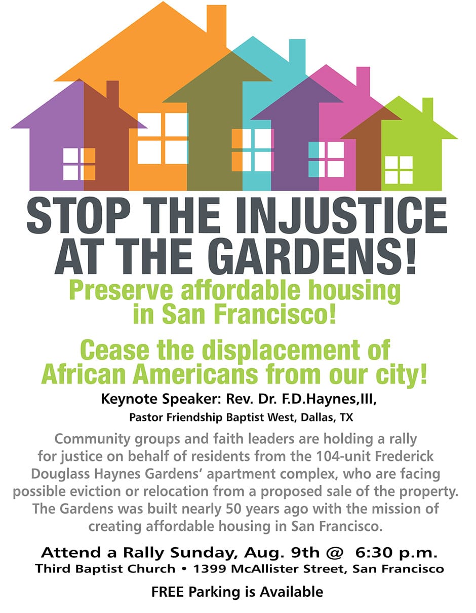 Residents, community groups and faith leaders will hold a rally for justice to protest the proposed sale of the 104-unit Frederick Douglass Haynes Gardens’ apartment complex. Residents are facing possible eviction or relocation from their longtime homes. The rally is Sunday, 6:30 p.m., at Third Baptist Church, 1399 McAllister St., San Francisco.