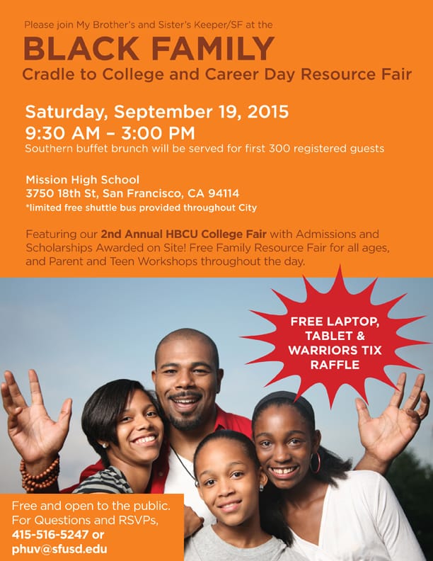 The Black Family Cradle to College and Career Resource Fair is Saturday, Sept. 19, 2015, 9 a.m.-3 p.m., at Mission High School, 3750 18th St., San Francisco, CA 94114. For more information or questions, call 415-516-5247 or email phuv@sfusd.edu.