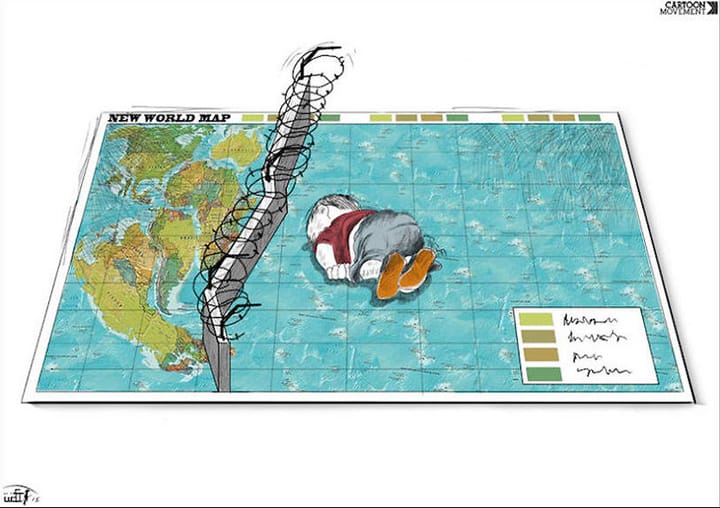 The Jordanian cartoonist Rafat Alkhateeb drew an image of Aylan Kurdi. The infant’s body lies on the other side of a barbed wire fence that separates him from the continents of the world.