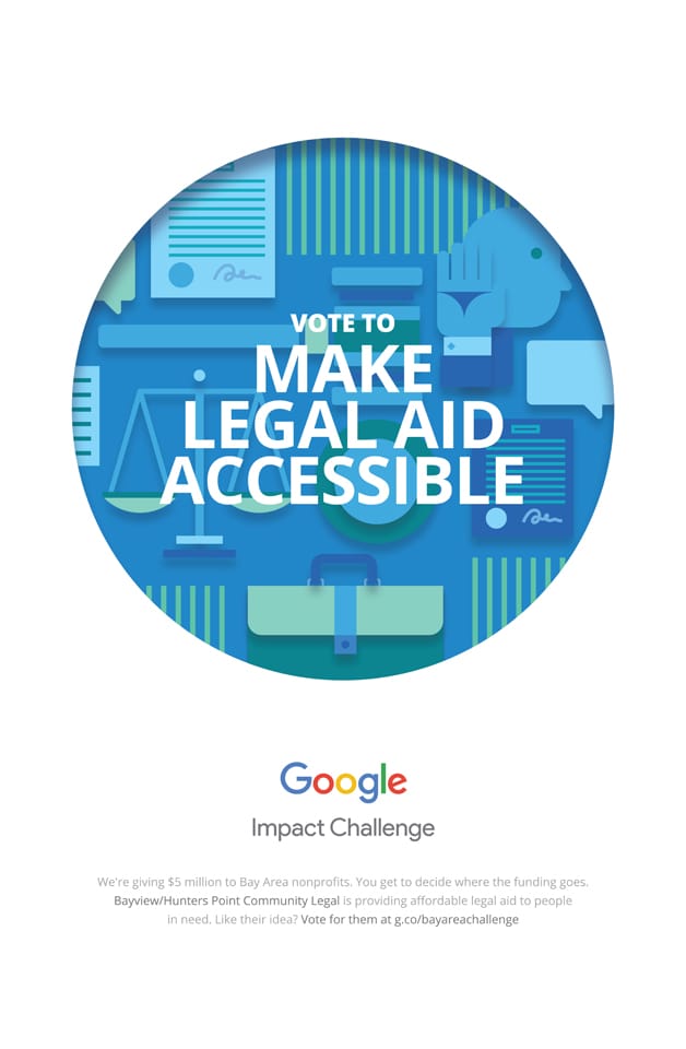 Now, Bayview Hunters Point Community Legal has the chance to expand our services to cover more households in San Francisco. But we need your help. Vote for us in the Google Impact Challenge and help us win $500,000. We’ll use the money to prove “justice for all” is not just a slogan but an achievable goal.