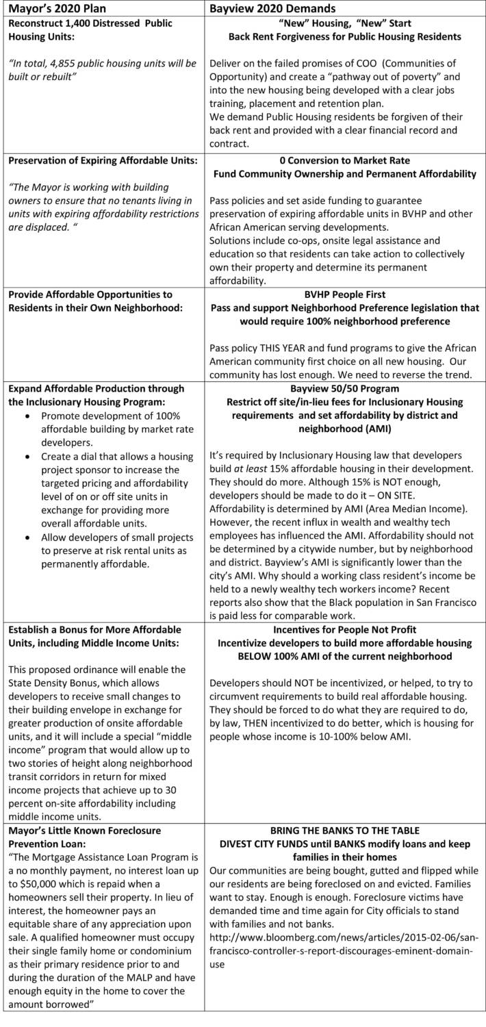 Residents believe that Ed Lee’s plan to provide height bonuses to developers to build affordable units for people who earn up to 150 percent AMI ($150,000 a year for a family of four) is just catering to his political donors and developers rather than preserving housing for communities like Bayview Hunters Point.