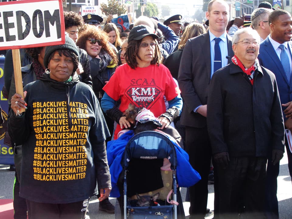 A surprise awaited me at the march’s front: SF Mayor Ed Lee strolled clear as day – flanked by two “suits” – behind Deacon G.L. Hodge, chair of the Interfaith Council. At Lee’s left was Mattie Scott, founder of San Francisco’s Healing 4 Our Families and Our Nation. Trailing Lee was a modest cluster of uniformed cops, “imaged” as if inadvertently marching – but not fooling the informed.