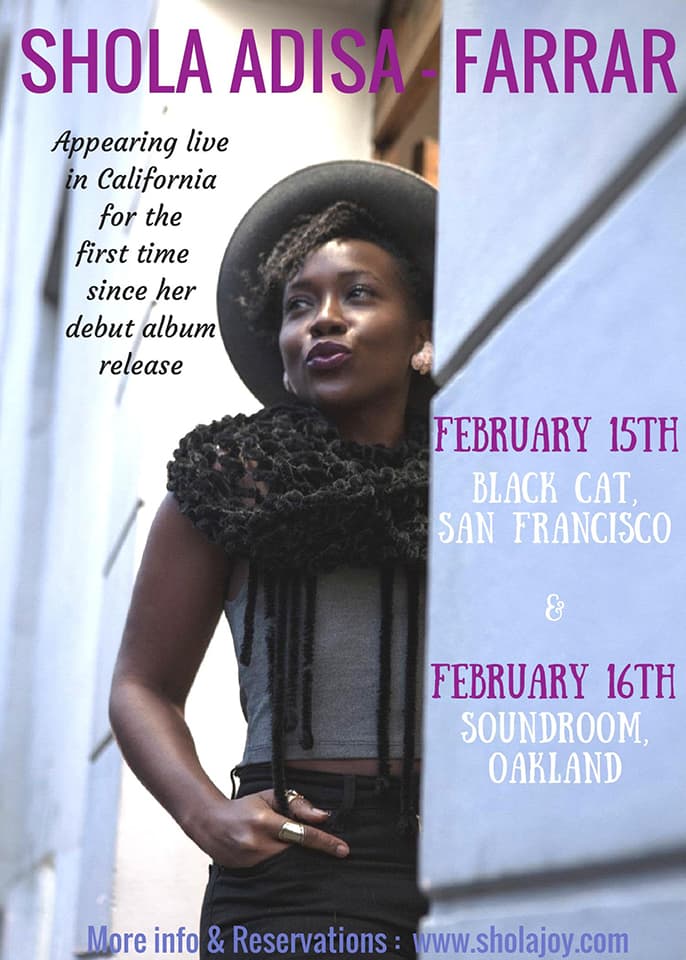 Shola Adisa-Farrar performs live in California for the first time since the release of her debut album, “Lost Myself.” She has two Bay Area dates: Wednesday, Feb. 15, at the Black Cat, San Francisco, two sets, first at 9:30 p.m. Reservations should be made at http://www.blackcatsf.com/event/shola-adisa-farrar or by calling 415-358-1999.