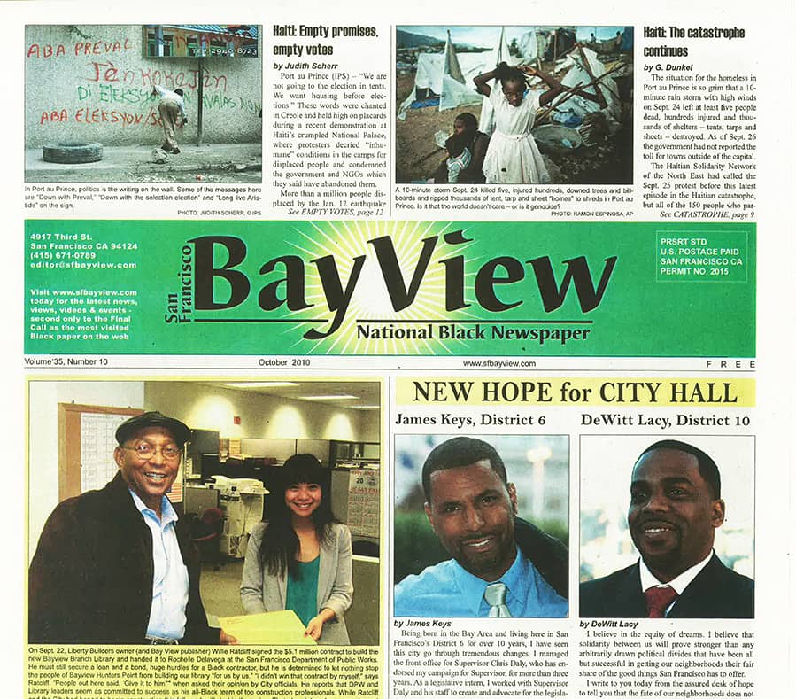 “Minister of Information JR recruited a medical-media team to travel to Haiti with 65 boxes of medical supplies to help the people heal and tell their truth,” begins the caption under a front page photo in the March 2010 Bay View. Young Stanford-trained Dr. Chris Zamani led the medical contingent and wrote the story under a picture of him caring for a tent full of Haitians. In “Haiti: A tale of two disasters,” he tells how Haitians have always “refused to be exploited” and “500,000 African slaves organized themselves to defeat Napolean’s army in a massive successful slave revolt that established the Haitian republic” in 1804. It was that spirit of never-say-die determination and racial pride that had originally led us to cover Haiti, hoping it would inspire our readers here in the U.S.