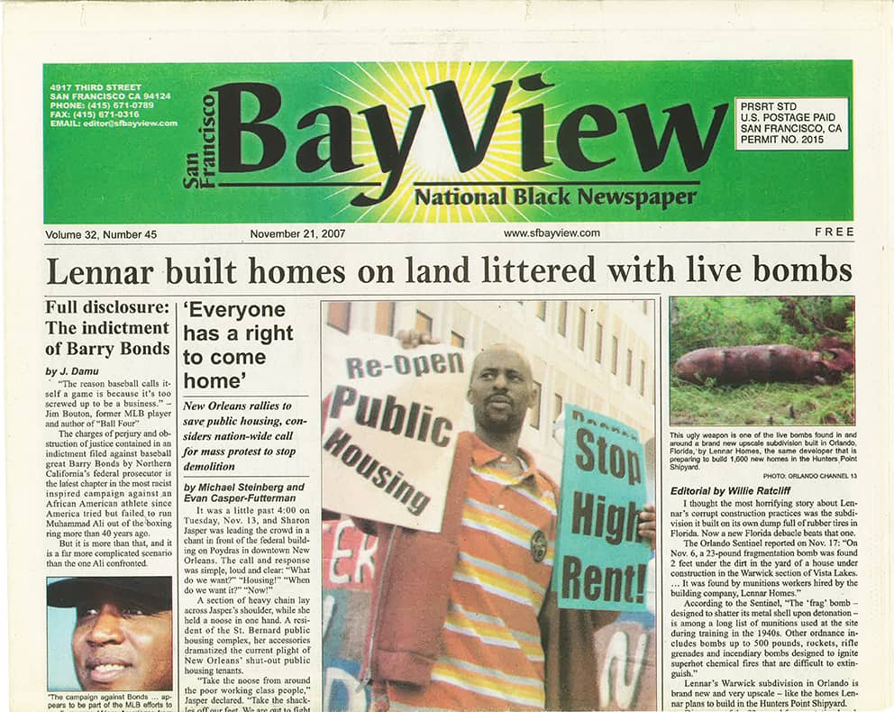And in “Will Navy’s radiological survey of homes on Treasure Island mean evicting 2,600 residents?” expert investigative reporter Carol Harvey launches a now two-and-a-half-year-long series advocating for the people of Treasure Island, most low-income and many formerly homeless, who must contend with the same triumvirate we’ve fought for decades in Bayview Hunters Point: the Navy, the City and Lennar.