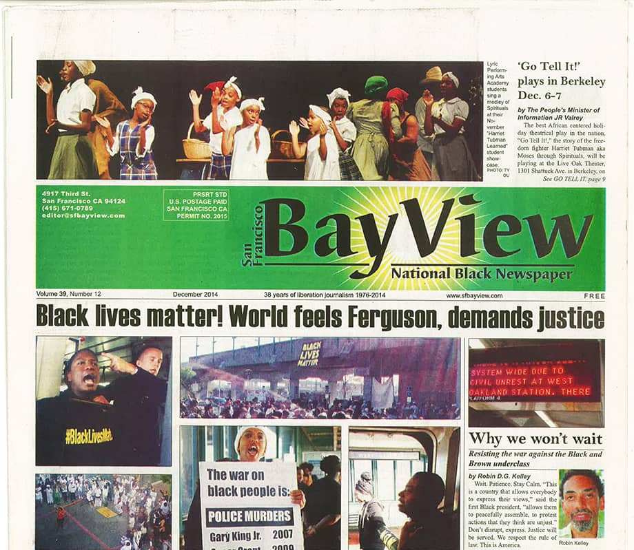 “Black lives matter! World feels Ferguson, demands justice” is the banner headline in December 2014 over dramatic photos of the first Black Lives Matter show of force in the Bay Area, where you might say Black Lives Matter was born; Alicia Garza, a forever friend of the Bay View, who has written stories and been pictured countless times organizing for POWER, the group she grew up in and later headed, is one of the three founders of Black Lives Matter and the one who coined their name.